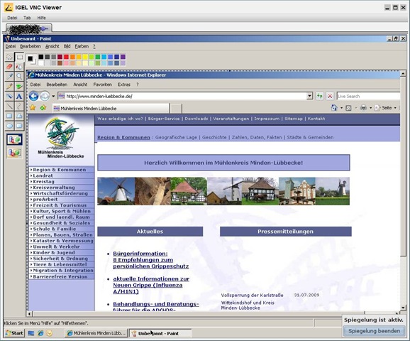 Verschiedene Benutzer von uns haben versucht die Webseite http://www.minden-luebbecke.de aufzurufen. Alle diese Benutzer arbeiten entweder mit einem etwas älteren Igel Gerät (z.B. 53XX LX und der Firmware 3.09.200) oder mit aktuellen Geräten der Universal Desktop Serie (z.B. UD5 mit Firmware 4.01.100.01). Die Benutzer verbinden sich alle per ICA-Verbindung zu einem „vollen“ Desktop eines Terminal-Servers und starten auf diesem den Internet-Explorer 7.
