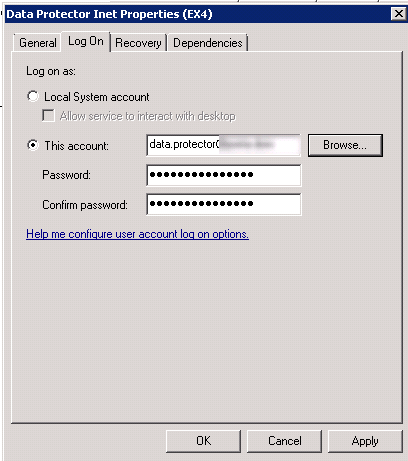 5. Change the “Log on” of the service “Data Protector Inet” to the user which was created in step 2. And restart the service. (When you change the “Log On” the user automatically gets the right to “Log on as a service”.)![]()