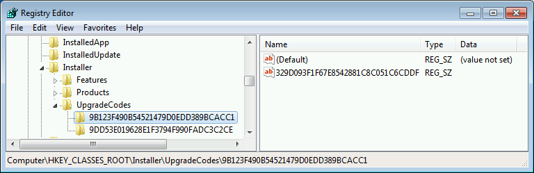HKEY_CLASSES_ROOT\Installer\UpgradeCodes\9B123F490B54521479D0EDD389BCACC1