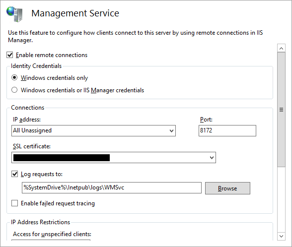 To check the certificate for the Web Management Service you have to open the IIS Manager, select the current server and switch to the Features View. Now open Management Service. ![]()