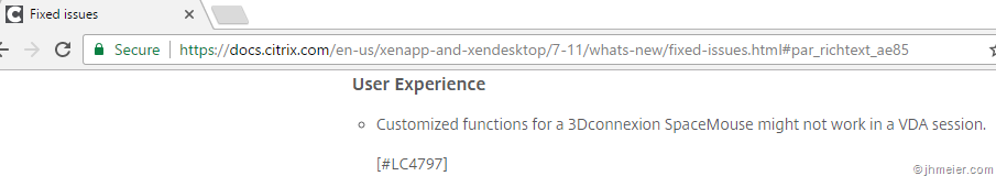 If you passthrough a 3DConnexion SpaceMouse to a Citrix HDX 3D Pro Session you expect that everything is working like on a local computer. Unfortunately that’s not always the truth. It might happen that the left side of Keys (Ctrl, Alt, ESC,…) are not working. Everything else instead is working fine. When you look at the release notes of XenDesktop 7.11 you find the following fix: