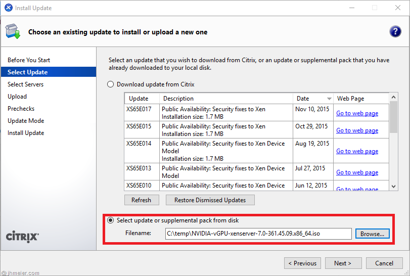 Choose “Select update or supplement pack from disk” and browse to the vGPU Iso from the Nvidia Driver Download Package. ![]()