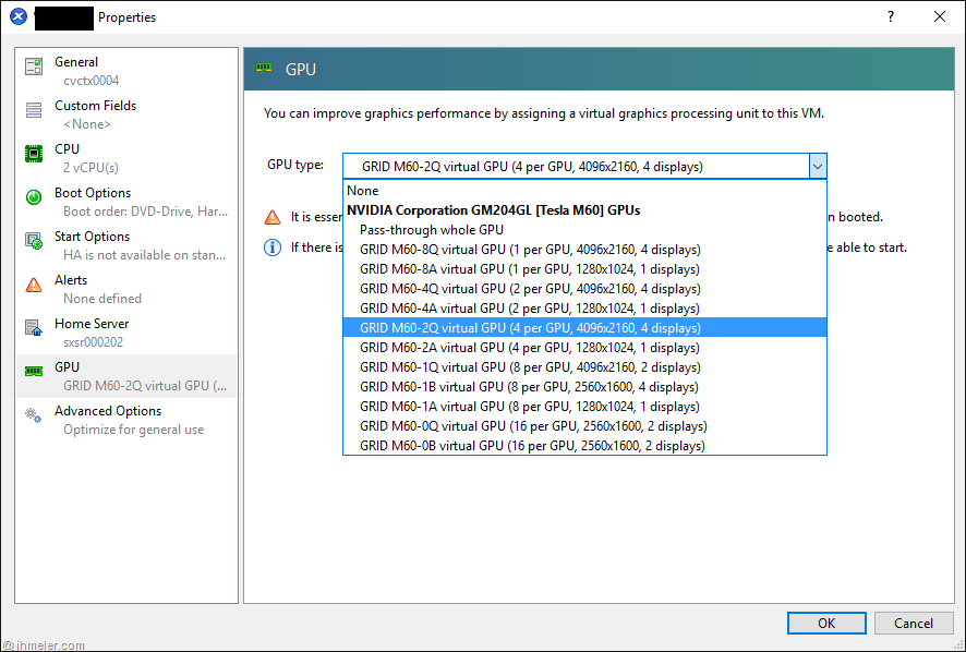 If you now open the Device Manager again and check the Graphics Card you will see a NVIDIA GRID card – here you can also see which vGPU-Type is assigned.