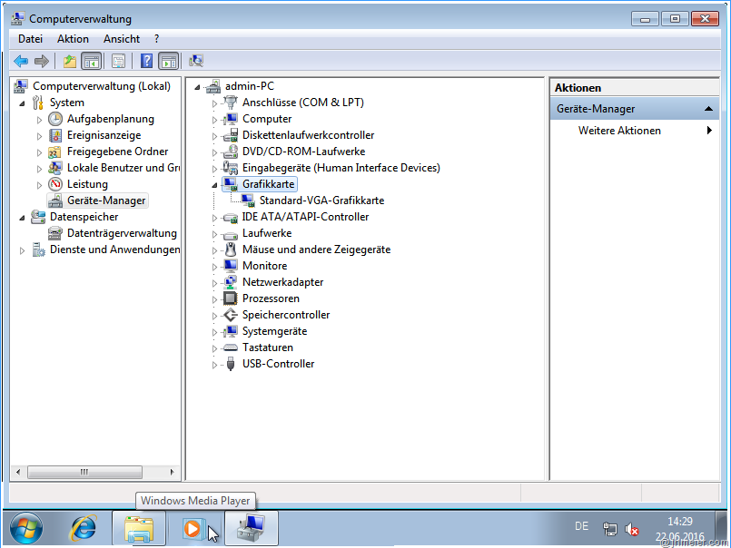 When you now start the VM and check the Device Manager you will still only see a Default VGA Graphics Card. To change that the necessary drivers need to be installed.