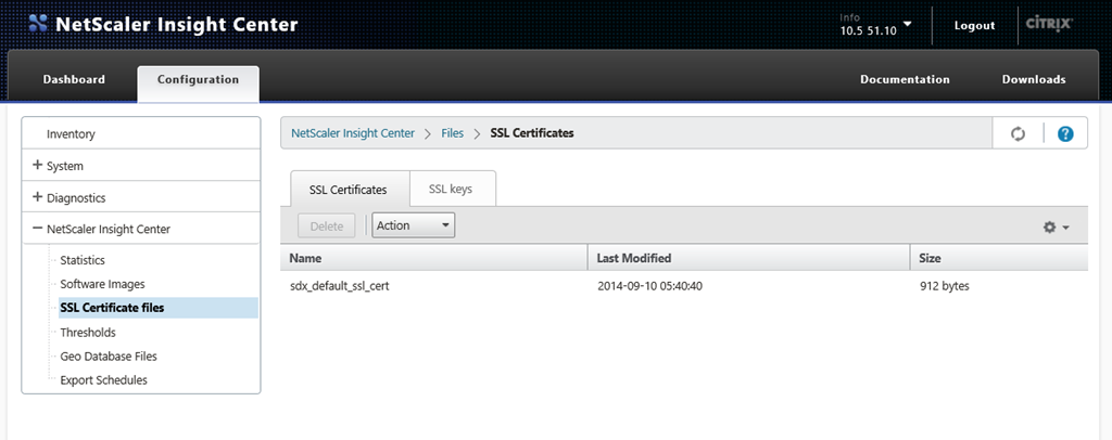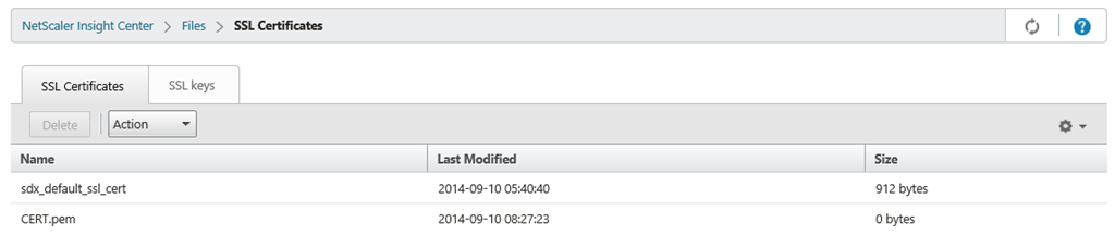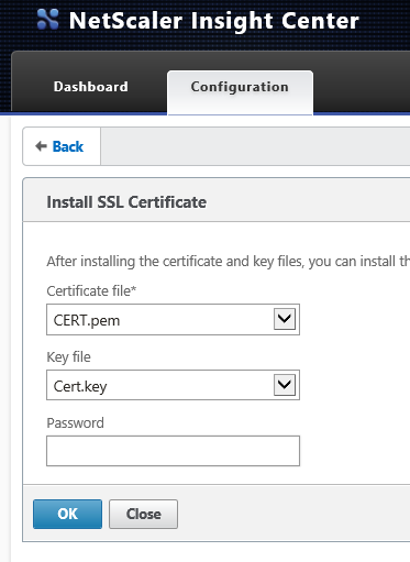 The first step is to create a host entry for your NetScaler Insight Center Appliance (NSICA) on your internal DNS server. Then you need to create a certificate (split into a PEM and a KEY file) with the FQDN of your NSICA. After you have created the certificate open the NSICA configuration and switch to CONFIGURATION => NETSCAKER INSIGHT CENTER => SSL CERTIFICATE FILES![]()