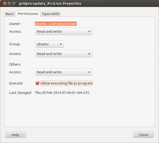 10. Open the properties of both files and change all “Access” types to “Read and write”. Furthermore activate “Allow executing files as a program”. ![]()