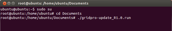 12. Inside the Terminal you first switch to the root account (sudo su) and then you open the folder Documents (cd Documents). To start the update you enter “./gridpro-update_R1.0.run” (without quotation marks). Alternatively you can enter “./gridpro-update-auto_R1.0.run”. The second one runs an autoupdate without userinteraction while the first asks you for every update if you would like to install the update. ![]()