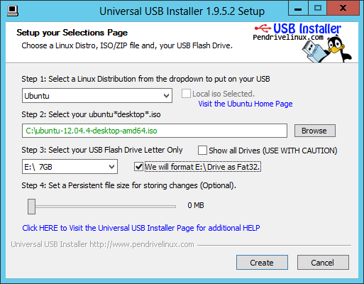 4. Choos Ubuntu as the Linux distribution, the downloaded iso and the USB-Stick to be used for creating the bootable USB stick