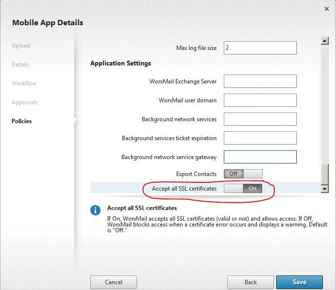 Actually that was not really a solution for us – deploying the internal Root-CA-Certificate to BYOD devices would have been a lot of work (people with BYOD devices don’t want to connect their device to the companies owned MDM-Solution for an automatic deployment). We started to look for other solutions and luckily Citrix just published the new WorxMail Version 1.3. After importing this version into the AppController a new Application Policy was available: