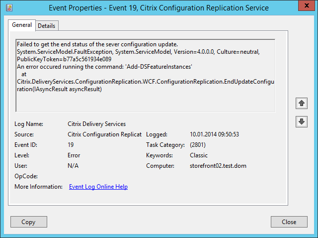 An error occured running the command: ‘Add-DSFeatureInstances’Log Name: Citrix Delivery Services